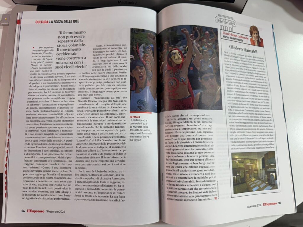 L’entretien marque également la republication en Italie du livre Lugar de Fala (Il luogo della parola), avec une préface de l’écrivaine Chimamanda Ngozi Adichie et une introduction inédite de la philosophe Grada Kilomba. « Le féminisme est enraciné dans des histoires de solidarité collective », souligne Djamila dans les pages du magazine italien.