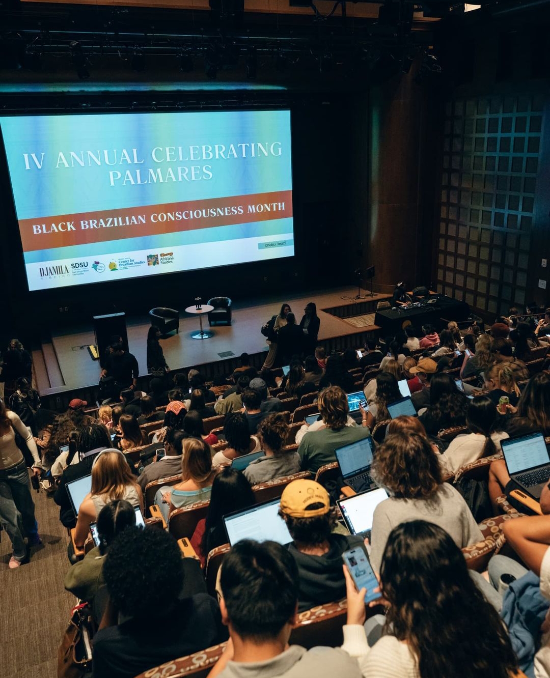 “Em San Diego, a recepção foi arrebatadora na SDSU, com um auditório repleto de olhares atentos e corações abertos. Agradeço ao Centro de Estudos Africanas e Centro de Estudos Brasileiros por todo suporte. Um agradecimento especial à professora Daniela Gomes, que fez uma excelente moderação, à Elisa Larkin, ao professor Abner Sótenos e à Flávia Soares, que trouxeram tanta luz e acolhimento ao evento”, escreveu Djamila.